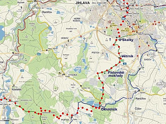 Pár kilometrů (asi šest) do Popic rychle uběhlo, v lokále jsme se domluvili, že všechny okolnosti jsou příznivé pro delší pobyt v přírodě – vytvořila se skupinka, která měla náladu jít po modré značce na Okrouhlík a pak po zeleně značené cestě do Jihlavy. Ještě musím dodat, že jsem tentokrát šla sama, Mirek asi cítil potřebu zdržet se vší společnosti a užívat si samoty. 🙂