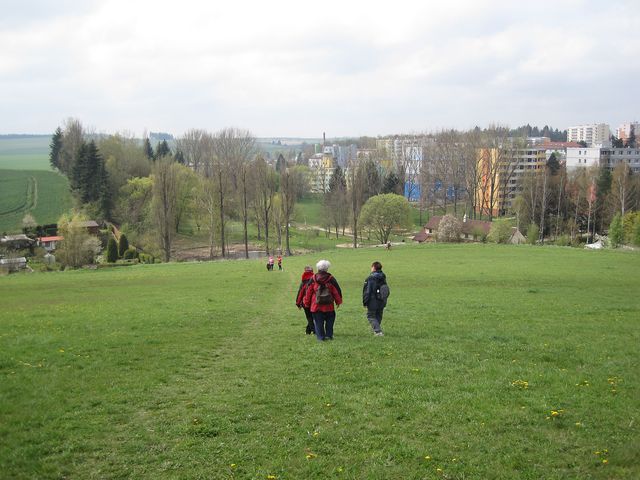 Staneme na kopci a díváme se na město od jihu – v pozadí jsou věže jihlavských kostelů, červená střecha radnice, bělostná Brána Matky Boží, v místech, kde je pod kopcem, kousek od Koželužského potoka, panelové sídliště a komín kotelny, býval dvůr Johanna Merforta, k němuž náležely okolní pozemky včetně travnatého pahorku.