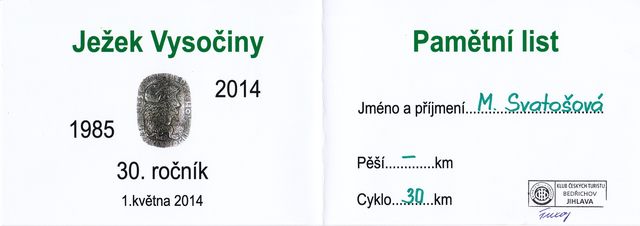 Letos se zúčastnilo akce 92 lidí – 69 pěších a 23 cykloturistů, všichni dostali krásný pamětní list, který měl připomenout, že 30. výročí konání dálkového pochodu není jen tak něco běžného (nezapomeňme, že se koná 1. máje) – to už je třeba vyvinout dost velkou invenci organizační, jinak by lidé nepřišli – tenhle zákon je neúprosný…
