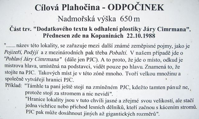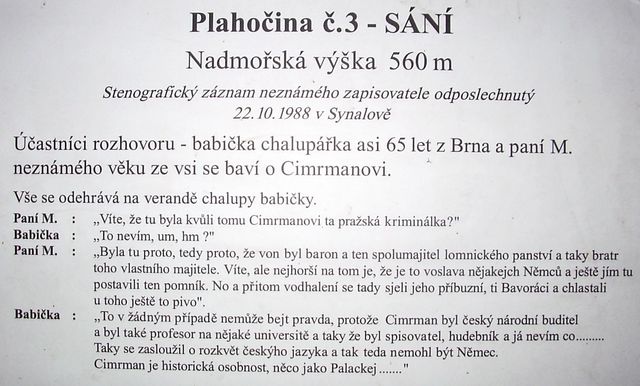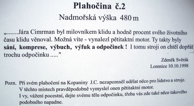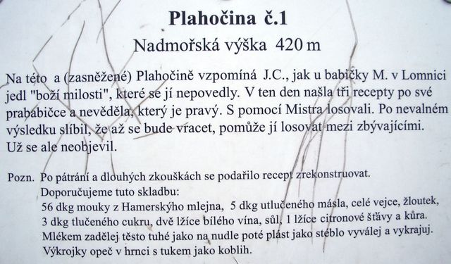 Mám neodbytný pocit, že ke dvěma předchozím článkům oslavujícím turistické taháky Tišnovska, patří výše zmíněná stezka, kterou jsme navštívili v roce 2006 (tehdy ještě náš blog neexistoval) a já moc ráda vzpomínám nejen na krajinu, ale v tomto případě hlavně na Plahočiny. Tak nazvali pánové Svěrák a Smoljak netradiční infotabule, které charakteristickým způsobem, vlastním těmto dvěma pánům, sdělují poutníkům podstatné věci nejen o Mistrovi, ale o životě vůbec.