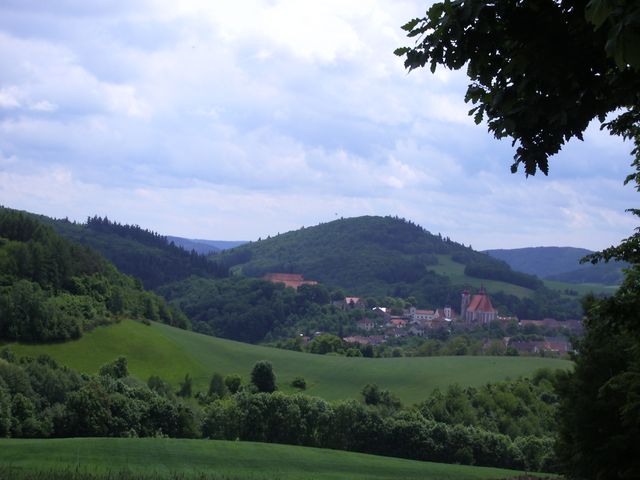 Krajina v okolí Lomnice u Tišnova je velmi členitá – to je ostatně jasné i z výčtu místních a geografických názvů – zařadím jen jeden obrázek Lomnice, jak jsme ji viděli z putování k Mistrovu Pohlaví: