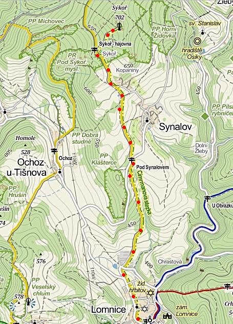 Nuže, stezka začíná na přívětivém náměstí v Lomnici u Tišnova a vede po žluté turistické značce Synalovskou kopaninou v Sýkořské hornatině do kopce k myslivně pod vrchem Sýkoř (702 metrů nad mořem), který je nazýván střechou Svratecké vrchoviny. (Povšimněte si těch květnatých názvů – možná proto si Jára Cimrman vybral tento kraj k návštěvě :-))