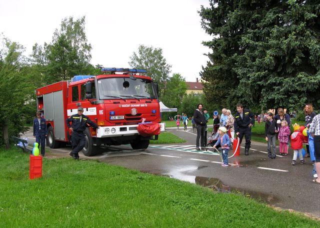 stále obstoupený zájemci byl hasičský vůz, z jehož cisterny proudila voda do hadice a šťastné děti se snažily zasáhnout určený cíl,