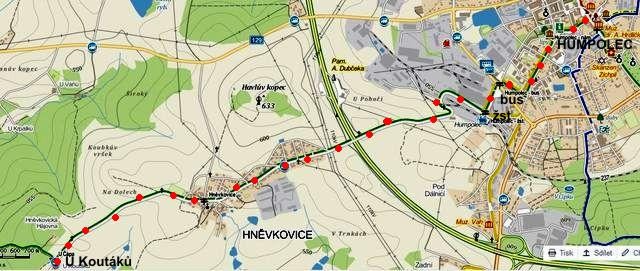 Na mapce je zachycena pětikilometrová trasa z Humpolce na rozcestí nazvané U Čapka, které je však na Mapy.cz označeno U Čápa nebo U Koutáků: