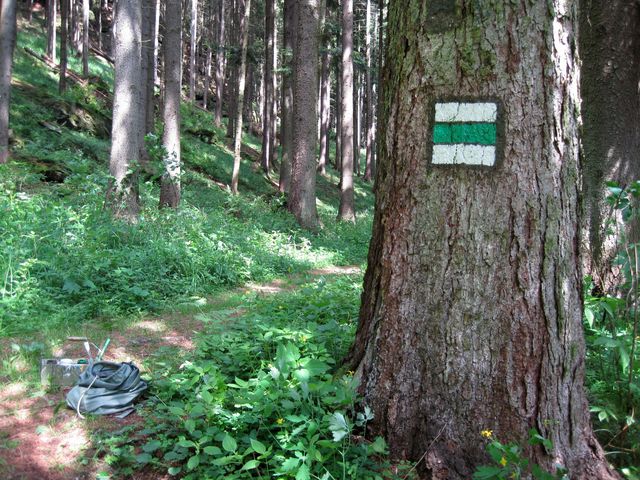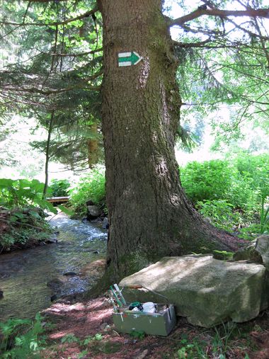 Protože byla neděle a krásné počasí, sešlo se po dobře značených přístupových cestách ke zdejšímu restauračnímu a rekreačnímu zařízení poměrně dost lidí – jeden sympatický pár jevil čilý zájem o značení – potěšilo nás, že kladli dobré otázky a v průběhu řeči vyšlo najevo, že jejich blízká příbuzná je zaměstnankyně ústředí KČT. Co si tak povídáme, najednou velký křik – jedna z jejich dcerek, které skákaly spolu s dalšími dětmi na trampolíně před restaurací, se srazila s jinou skokankou a teď jí z roztrženého obočí hrnula krev. Nastal zmatek – bylo třeba základního ošetření. Vytáhli jsme z batůžku značkařskou lékárničku a poskytli děvčátku první pomoc. Přihlížející ocenili naši připravenost a prestiž českých značkařů značně stoupla! 🙂 Když rodiče odváželi holčičku na chirurgickou ambulanci, dokonce se na nás usmívala…