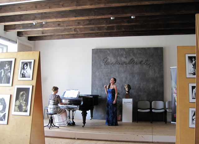 a samozřejmě byli v neděli odpoledne na místě. Úvodem promluvil doc. Jiří Štilec, pořadatel festivalu a zároveň s Janou Černou kurátor výstavy. Loni ke konci roku mohli unikátní fotografie ze života vynikající zpěvačky obdivovat návštěvníci galerie ve věži Novoměstské radnice v Praze – nyní byly instalovány na panelech v hudebním sále Mahlerova rodného domu.