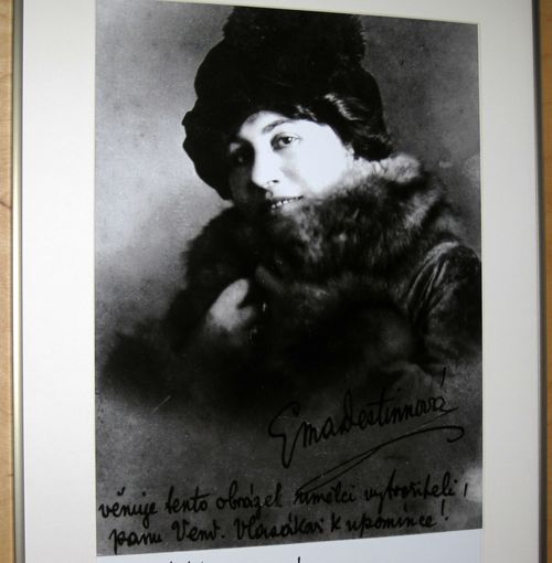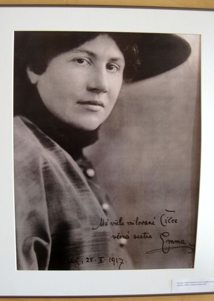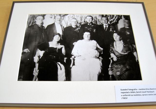 Na popisku k fotografii bylo uvedeno: nevěsta Ema Destinnová v bílém, ženich Josef Halsbach v uniformě za nevěstou, vpravo sestra Jindřiška.