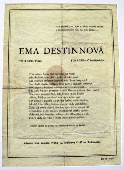 Ema Destinnová zemřela 28. ledna 1930 v Českých Budějovicích na mozkovou mrtvici, pochovaná je na vyšehradském Slavíně.