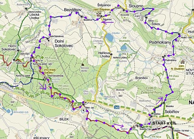 Trasa: Sobíňov – Březinka – Podmoklany – Štikov – Sloupno – Štěpánov – Bezděkov – Dolní Sokolovec – Točitý vír – Sokolohrady – Bílek – Sobíňov žst. – Sobíňov U Štefana = 25 km