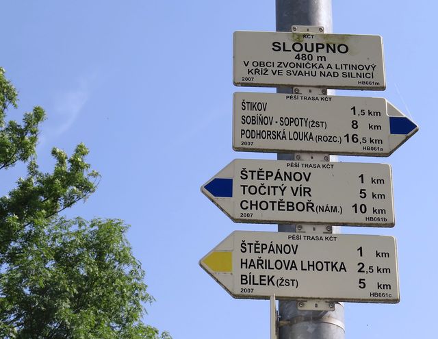 Sešli jsme hodně zanedbanou a velmi špatně značenou turistickou stezkou dolů do Sloupna