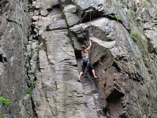přes který jsme se dostali (stoupáním :-)) do Dolního Sokolovce. K výstavbě nejstarších domů v obci prý bylo použito kamene z nedalekého zbořeného hrádku loupeživých rytířů, kteří si v 15. století zbudovali základnu pro své nekalé rejdy na skalním ostrohu nad kaňonem řeky Doubravky. Řeč je o Sokolohradech, ke kterým jsme zanedlouho po sestupu k Točitému víru a vstupu na červeně značenou cestu údolím Doubravy vzhlíželi od řeky společně se skupinkou mladých horolezců zkoušejících vyšplhat po skále a ztéci odtud nedobytné středověké sídlo.
