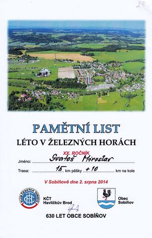 Pořadatelé ze Sobíňova navrhli pro 20. ročník pochodu Léto v Železných horách tak atraktivní trasy, že jsme nemohli nepřijet. Start i cíl byly tradičně v hostinci U Štefana a v krásném letním ránu se to na sobíňovské návsi turisty jen hemžilo. Měli jsme jasnou představu o dnešním dni, proto jsme si vybrali trasu, která nás po modře značené turistické cestě dovedla od nivy Doubravy na hřeben Železných hor a pak okruhem znovu svedla do pohádkového říčního údolí.