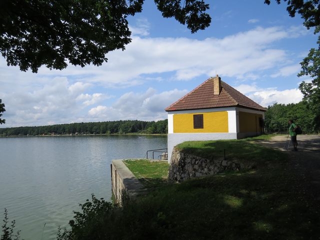 a po červené značce se vydali, už bez deště, na stezku kolem Dvořiště, druhého nejstaršího rybníka na jihu Čech. (Nejstarší je Bošilecký rybník – založen 1355.) Dvořiště je vlastně přehrada na Miletínském potoce a v historických pramenech se uvádí jeho existence už před rokem 1363.