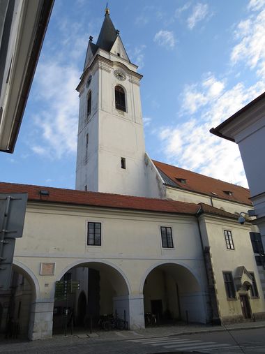 Kostel sv. Jiljí (Egidius) byl připomínán už v roce 1280, jeho 36 metrů vysoká věž je dominantou Třeboně. V roce 1367 byl ve městě založen augustiniánský klášter, perla jihočeské gotiky, a kostel se stal jeho součástí. Průvodce nám ukázal překrásnou křížovou chodbou s malovaným žebrovím a freskami ze 14. století, vysvětlil původ a téma lunet.