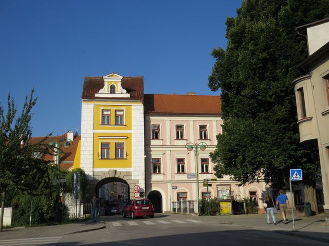 východní stranu náměstí uzavírá o století starší brána Hradecká