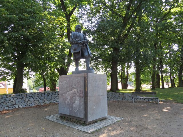nebo snad sochu geniálního stavitele rožmberských rybníků Jakuba Krčína z Jelčan a Sedlčan (1535–1604), který dostavěl rybník Svět v roce 1574.