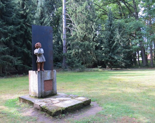 Červená značka, jejíž trasu kopíruje i naučná stezka, nás dovedla kolem nové sochy Anděla Strážce, kterou současní autoři Anna Hulačová a Václav Litvan umístili na prázdný sokl v parku,