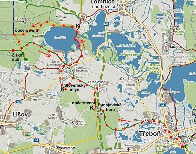 Trasa: Třeboň – ZTZ Břilice – Dunajovická hora – Dunajovice – Slověnický mlýn – Slověnice – ČTZ rybník Dvořiště, okruh – ŽTZ Na hrázi – ZTZ směr Slověnice = celkem 27 km