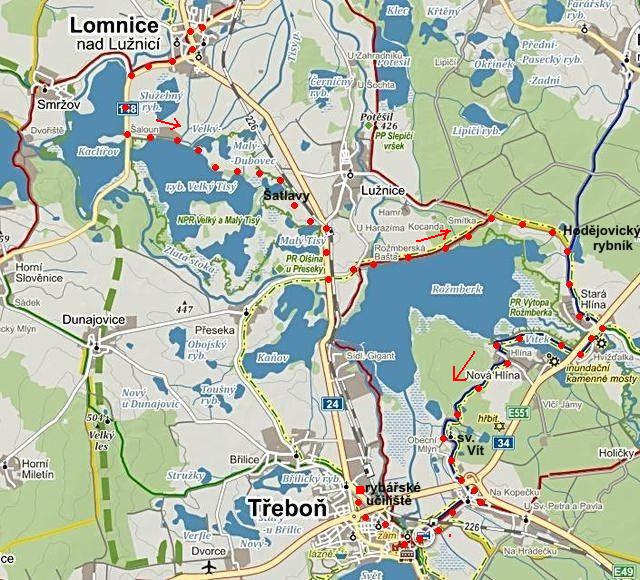 Lomnice nad Lužnicí – ČTZ sádky Šaloun, pak po vlastním značení kolem rybníků Velký a Malý Tisý a Šatlavy k žst. Lužnice – po cyklotrase 1034 na hráz rybníka Rožmberk – Výtopa – Snítka – ŽTZ rybník Hodějov – MTZ Stará Hlína – rybník Vítek – Nová Hlína – kaple sv. Víta – Na Kopečku – Třeboň – ubytovna = celkem 26,5 km