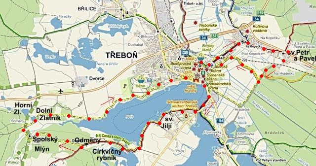 Trasa: Třeboň ČTZ – Bertiny lázně – Na Kopečku – sv. Petr a Pavel – k ŽTZ – náměstí – ČTZ hráz rybníka Svět – Schwarzenberská hrobka – Církvičný rybník – Odměny – Spolský mlýn – NS Cesta kolem Světa – lázně Aurora – hotel Bohemia – náměstí – ubytovna Krčínova učiliště = celkem 22,5 km