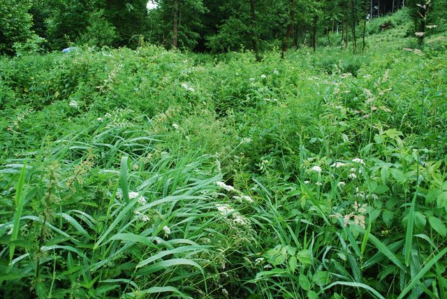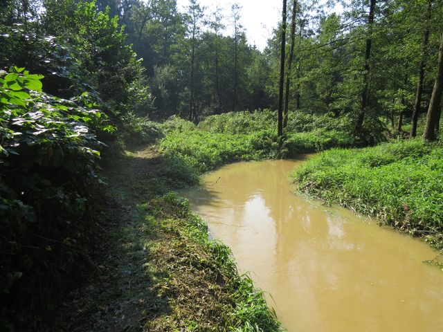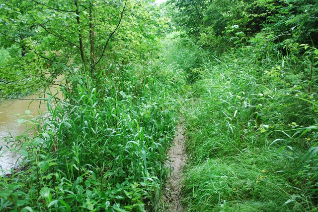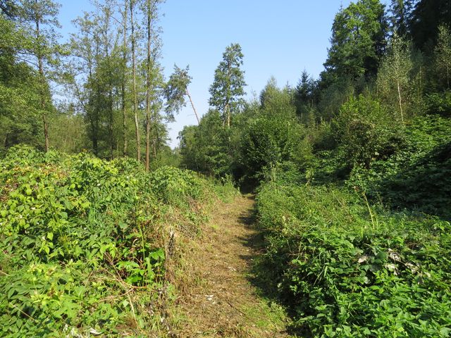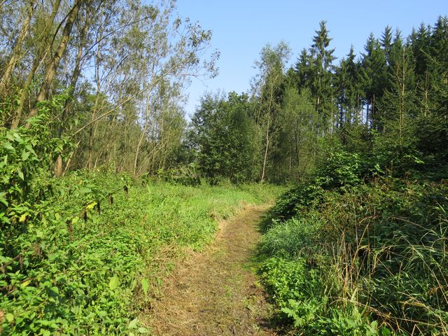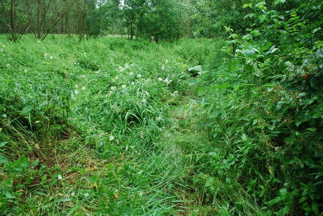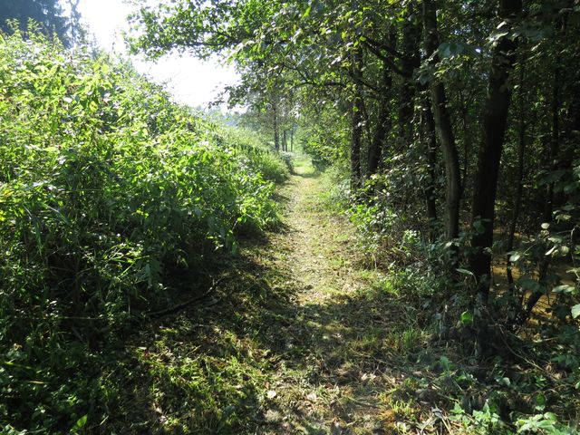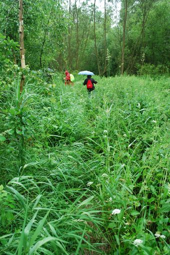 A hned po dosažení úseku kolem potoka Žabince jsme užasli – stezka, která vede údolím potoka a vlhkými loukami směrem k Petrkovu, byla vysečená a skvěle průchozí! Po návratu jsme se dozvěděli, že turisté-pořadatelé se domluvili s městem na způsobu zajištění průchodnosti stezky v plném rozsahu ve všech ročních obdobích a aktivně se na vyčištění zanedbaných úseků podíleli. A hlavně – nebude to jednorázová akce… Vím, o čem mluvím, procházeli jsme ji loni v červnu a pro srovnání zařadím obrázky.