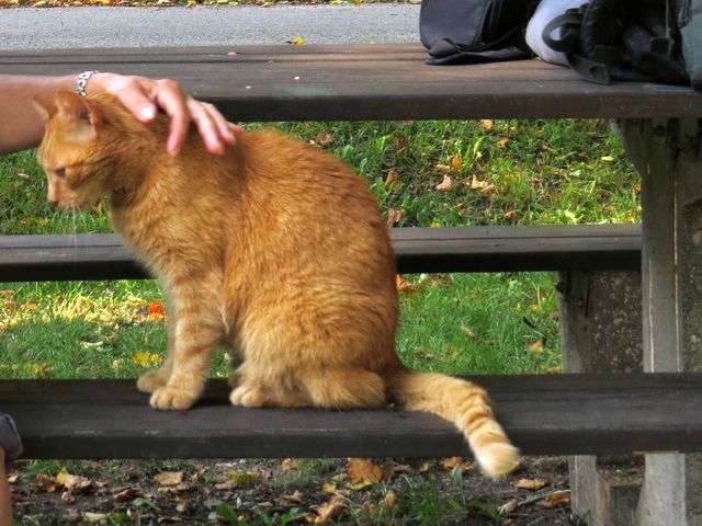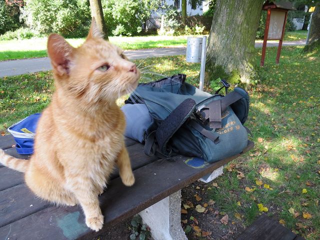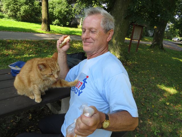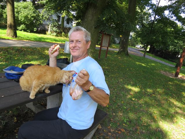 Co jsme tam přemítali a vzpomínali, vyšla ze dvora majestátně jako vyslankyně vší země rezavá kočka, jedna ze sedmnácti, kterým celé stavení s přilehlou zahradou a hospodářstvím patří, a doprovázela nás k odpočívadlu na blízké návsi, kde jsme si naplánovali svačinu.