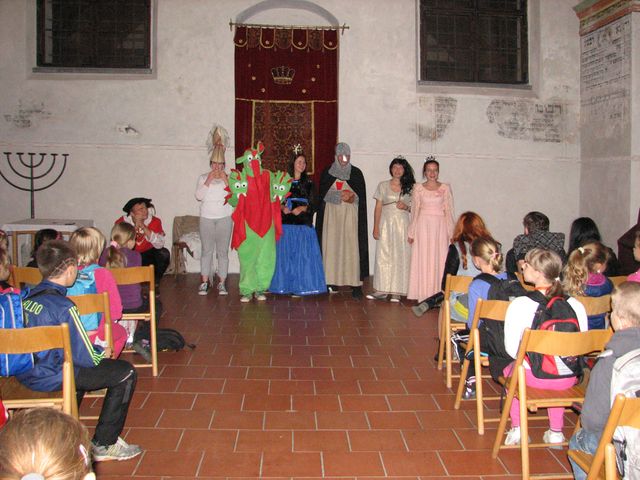 Na posledním, šestém, stanovišti v Nové synagoze se pak rozdováděné děti usadily a v tajemném prostředí historického objektu sledovaly napínavou pohádku o Bajajovi, kterou jim zahráli studenti třebíčské hotelové školy.
