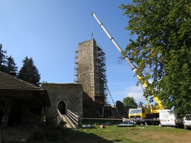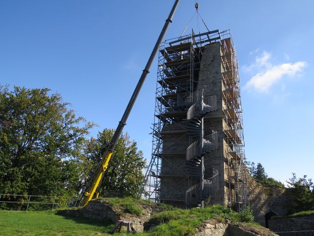 Už zdáli bylo vidět rameno jeřábu u kamenné hranolové věže – rozhledna tedy není dosud dokončená.