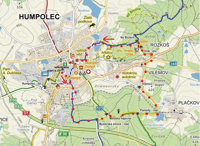 Trasa vycházky: Humpolec sokolovna – k MTZ, po ní k rozcestí Bysterská silnice ŽTZ – Městská hájovna – rozcestí Pařezitý (Plačkovský rybník) – Vilémov – Rozkoš – zřícenina hradu Orlík – Na Štůlách MTZ – kolem židovského hřbitova na náměstí a k sokolovně = 10 km