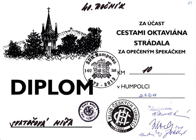 Na jeden z hezkých dnů prožitých s turistikou a vším, co dobrého k ní patří, bude upomínat diplom od pořadatelů: