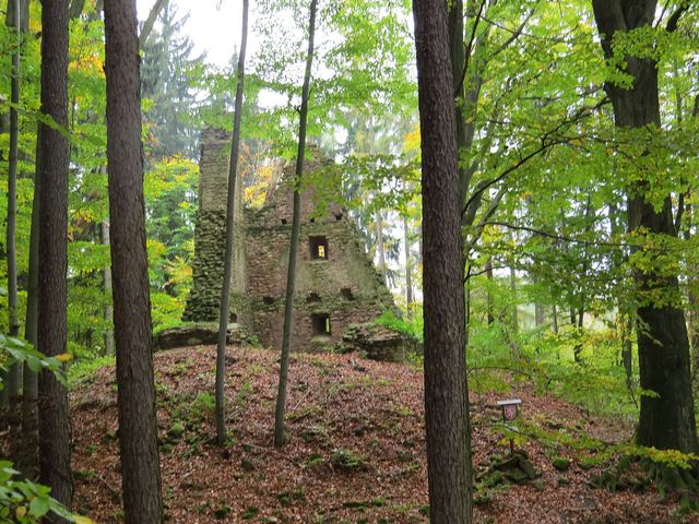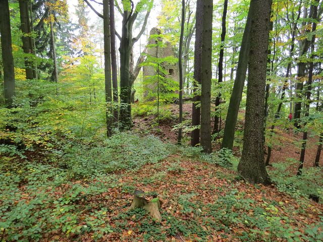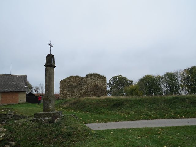 Pokračovali jsme po svahu dolů, stále po zelené značce, až na jedné příčné cestě zaveleli Korbelovi vlevo, pak zase dolů a po nějaké době se před námi na západním úpatí objevila tvrz Melechov, v době pro ni akční, když ji na začátku 15. století obývali bratři Albert a Ratimír, nazývaná Nelechov.