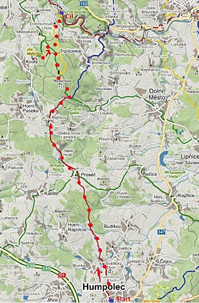 Trasa: Humpolec ČTZ – centrum – kompostárna – Světlický Dvůr – Rápotický les – Proseč – Staré Hutě – smírčí kámen – Rejčkov – Čertova hlava – Rohule ZTZ – Melechov vrchol – Melechov věž – Melechovská studánka – ZTZ – Melechov tvrz – neznačenou cestou k ŽTZ – Dobrovítova Lhota – Stvořidla = 23 km