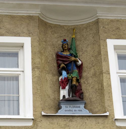Naší pozornosti neušla ani ve fasádě jednoho z historických domů vestavěná barevná socha sv. Floriána pocházející z poloviny 18. století.