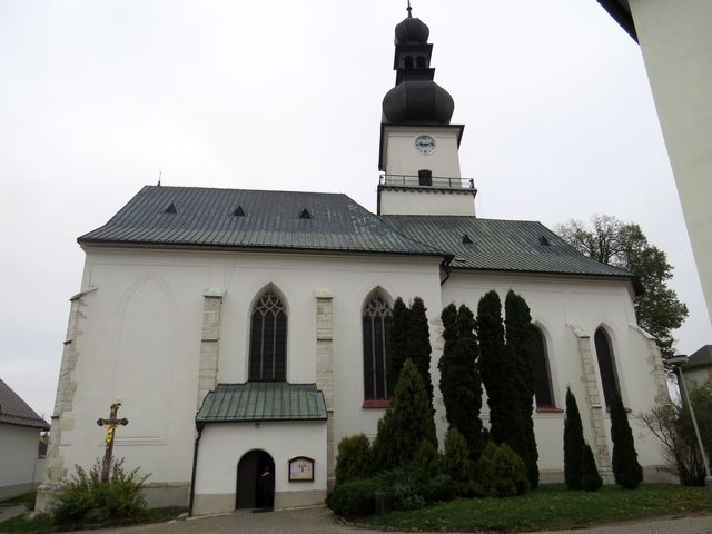 Odborníci usuzují, že kostel stál na ostrohu u řeky Sázavy patrně už v průběhu 13. století, ale první věrohodná písemná zmínka o něm je datována až na konci století následujícího. Kostel zdálky zaujme lichoběžníkovou věží vysokou 53 metrů, v interiéru nás přímo ohromí krása patnácti zastavení křížové cesty – v roce 1978 ji z cínových reliéfů vytvořil akademický sochař a restaurátor Karel Stádník (1924–2011), deset let poté navrhl i zdejší oltář – vřele doporučujeme návštěvu, je to perla! Tento umělec se téměř výhradně věnoval sakrálnímu umění – pro několik kostelů vytvořil křížové cesty, navrhoval oltáře, restauroval sochy; církvi sloužil i jako jáhen.