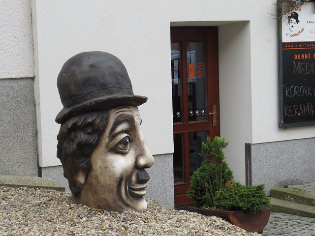 Ve Veselské ulici, kde má galerii Michal Olšiak, vyfotil Mirek jeho plastiku – Charlieho, který dělá parádu u místní vinotéky od roku 2011.