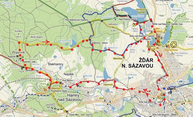 Žďár – sokolovna – náměstí ČTZ – zahradní centrum – Hamroň – rybník Dívka – Hamry nad Sázavou – Mamut – Rozštípená skála – Šlakhamry – Konec světa – hraniční kámen ŽTZ – Peperek – rybník Rýznarka – jezírko Vápenice MTZ – rybník Mikšovec – Mamlas – Starý Dvůr – U Jordánka – Tálský mlýn – hráz Pilské nádrže – sportovní areál Pilák – hranice česko-moravská – cukrárna – ČTZ kolem Sázavy – Žďár náměstí – sokolovna = 22 km