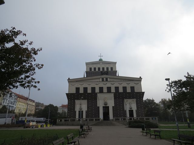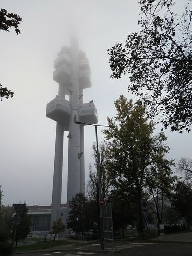 Za dvě hodinky od vykročení z domova už jsme se vydali z autobusového nádraží Florenc na poznávací výlet na Vinohrady. Do začátku pietního aktu na vrchu Vítkově (v 10:00) zbývala trocha času, kterou jsme chtěli věnovat prohlídce kostela postaveného podle návrhu Josipa Plečnika. Zvolili jsme cestu tak, aby nás dovedla na rozhraní Žižkova a Vinohrad do blízkosti haněného i vychvalovaného vysílače zprovozněného v roce 1992 – bylo ovšem tak mlžné ráno, že jsme stěží zahlédli mimina Davida Černého lezoucí po stožáru…