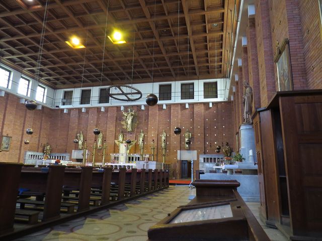 Pod dřevěným kazetovým stropem ve výšce 14 metrů je řada oken, jejichž barevnou výzdobu s motivem Srdce Páně navrhl Karel Svolinský, obrazy křížové cesty jsou dílem Františka Doubka.