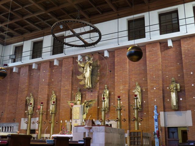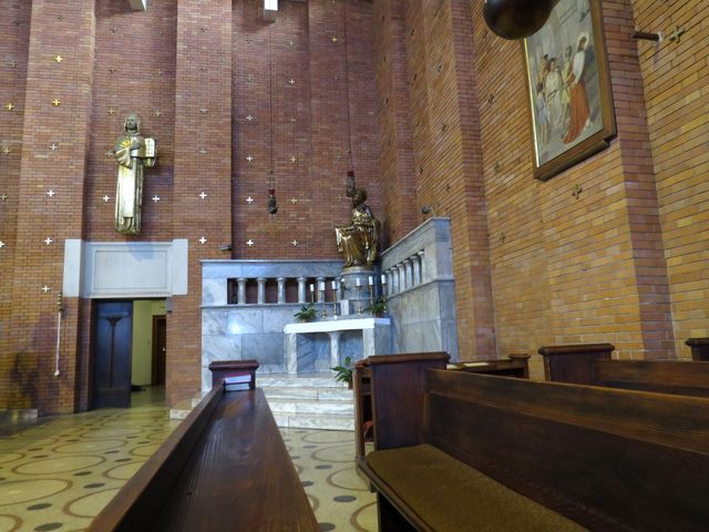 v sále s rozměry 26 x 38 metrů je oltářní stůl z bílého mramoru, nad ním se vznáší třímetrová postava Krista, pod níž shlíží na věřící šest českých patronů v nadživotní velikosti. (Sochy vytvořil Damián Pešan.)