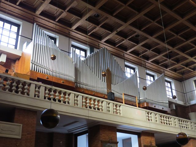 Interiér kostela navržený Plečnikem má také neobvyklý vzhled: