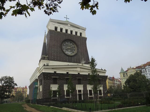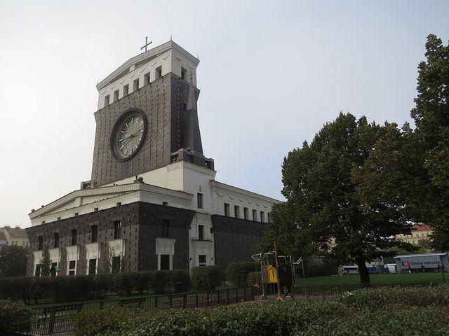 Netrvalo dlouho a stáli jsme na náměstí Jiřího z Poděbrad, jehož ústředním bodem je kostel Nejsvětějšího srdce Páně, jehož základní kámen byl položen právě 28. října 1928 při příležitosti 10. výročí vzniku samostatného Československa.