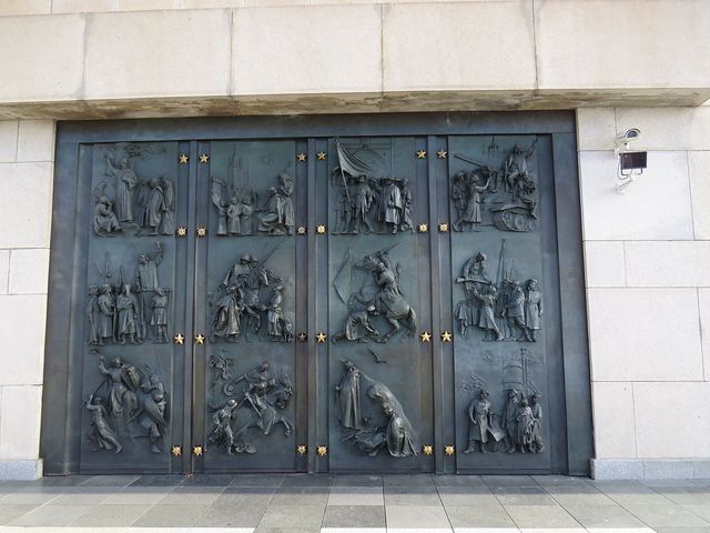 My jsme se po detailní prohlídce výjevů z doby husitské na bronzových vstupních vratech do památníku, které jsou dílem Josefa Malejovského (1914–2003),