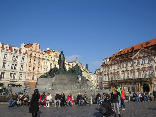 Autorem Husova pomníku, který byl odhalen v roce 1915 k pětistému výročí upálení Mistra Jana (6. 7. 1415), je Ladislav Šaloun. Jan Hus stojí uprostřed skupiny postav symbolizujících husity a pobělohorské emigranty, dívá se směrem k Týnskému chrámu, který byl v době husitské centrem kališníků; emigranti jsou blíže k místu popravy 27 českých pánů po porážce stavovského povstání v roce 1621.