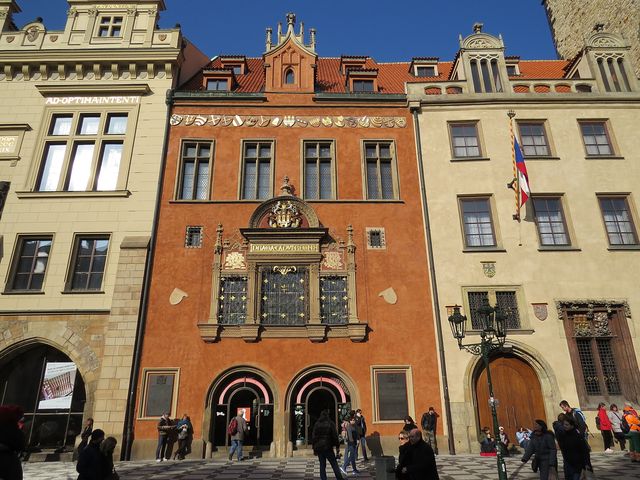 Radnice vznikla na začátku 14. století, během let byla samozřejmě i rozšiřována a přestavována; na konci 2. světové války jedno křídlo objektu zle poničil požár – zatím však zůstává nedostavěná. Nejobdivovanější je orloj na jižní straně 70 metrů vysoké věže Staroměstské radnice vytvořený Mikulášem z Kadaně na počátku 15. století – od svého vzniku je orloj v činné službě –