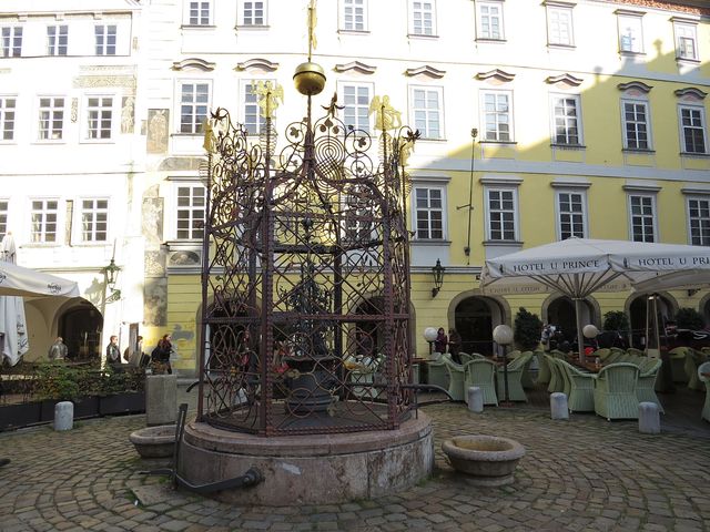 Pár kroků od Staroměstského je Malé náměstí, známé železářstvím U Rotta a kašnou s překrásnou kovanou renesanční mříží: