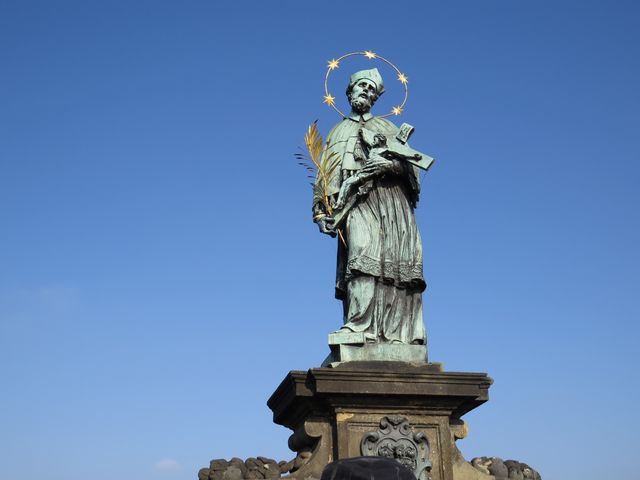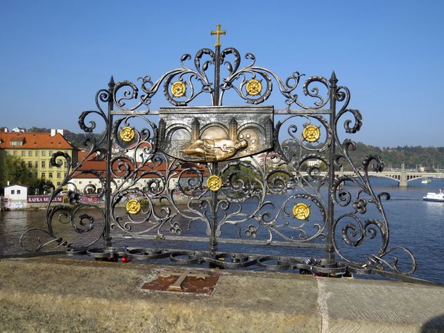 Světcův příběh je dostatečně znám (viz také M+M Svatošovi – Svatojakubská cesta), proto jen připomenu, že 20. 3. 1393 byl generální vikář pražského arcibiskupa vinou napjatých politických poměrů v království při výslechu umučen a jeho mrtvé tělo svrženo z Kamenného mostu (od roku 1870 nazývaného Karlův) do Vltavy. Místo, odkud byl Jan Nepomucký, svatořečený roku 1729, hozen do vody, je asi v polovině mostu – poznáme jej podle mramorové destičky s dvojramenným křížem a pěti hvězdami, pod níž je do kamenného zábradlí mostu uložena část ostatků z těla mučedníkova.