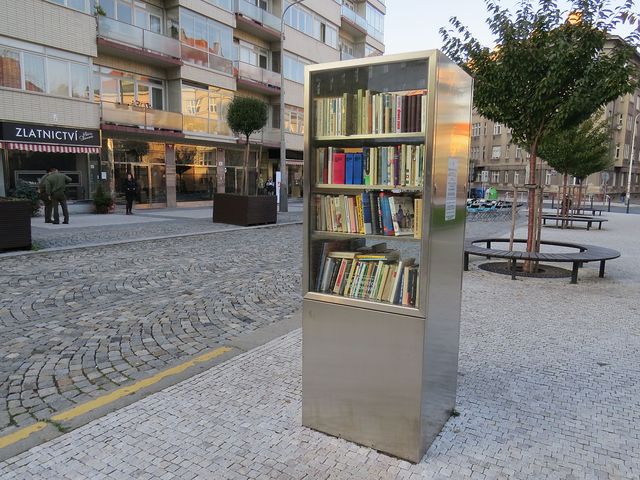 Společně s Miluškou a Pavlem jsme odjeli na poslední štaci – městská část Praha 6 letos uspořádala oslavy vzniku republiky kvůli opravám Písecké brány v takzvaném Skleněném paláci na náměstí Svobody. A hned při vystoupení z auta nás zaujala pouliční knihovna – prý byla první v Praze, je tu od října 2012 – kdokoli si může půjčit, po přečtení vrátí a případně přidá svoje knížky pro radost bližním.