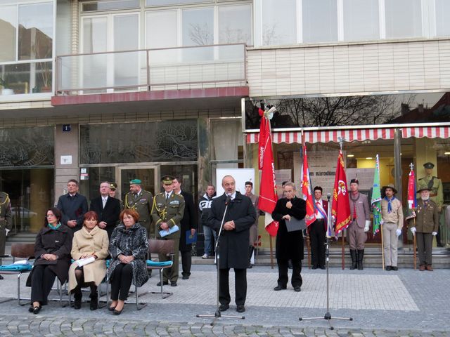Před budovou se sešlo pár desítek lidí, proběhly proslovy – za smysluplný a vysoce aktuální jsme považovali ten, který přednesli paní Miroslava Němcová a senátor Bratský. Součástí vzpomínkové oslavy byla doprovodná výstava Světová válka a naše revoluce – na panelech byly, doplněné fotografiemi, přehledně popsané historické souvislosti při vyhlášení samostatného státu, rozloha První republiky a osudy „mužů 28. října“.