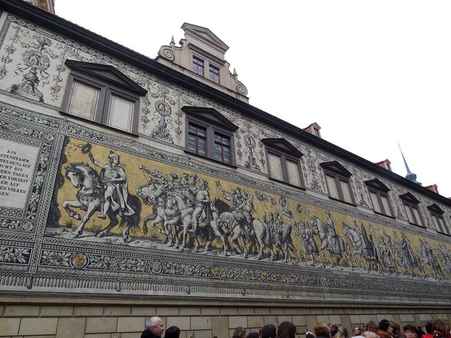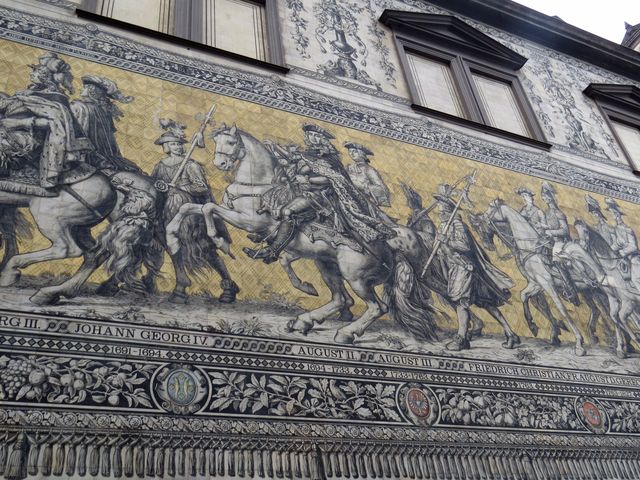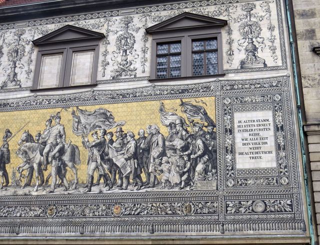 Obrazová historie rodu Wettinů, tzv. Knížecí průvod (Fürstenzug), je k vidění v Augustově ulici (Augustusstraße) vedoucí k zámku. Jezdecký průvod bezmála stovky postav dlouhý 102 metrů je vytvořen z 25 tisíc destiček míšeňského porcelánu,