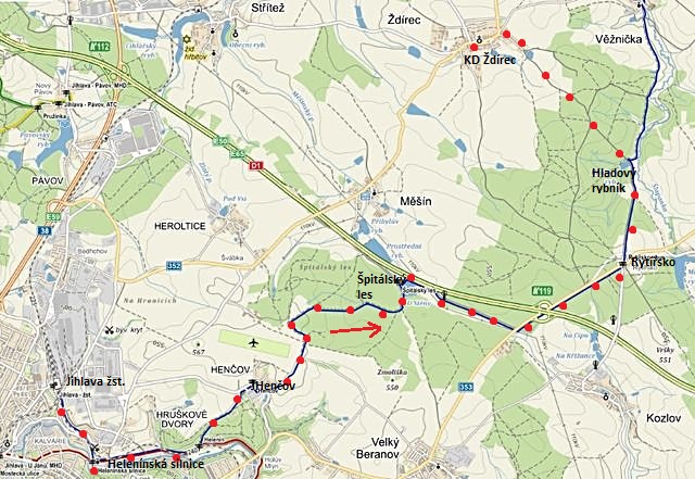 Trasa: žst. Jihlava MTZ – Helenínská silnice – Hruškové Dvory – Henčov – kolem letiště – Špitálský les – Rytířsko – Hladový rybník – neznačenou cestou do Ždírce = 13 km (někteří říkají, že je to 15 km 🙂 )